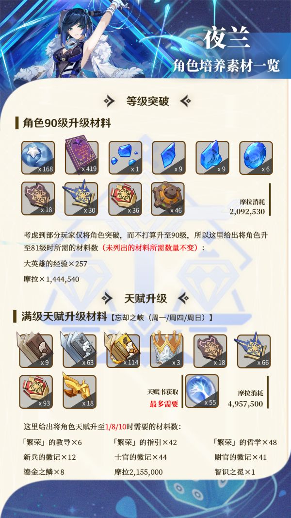 下图展示将夜兰升级至90级、天赋升级至10/10/10时(未计算命之座加成)所需要的素材数量。小字部分补充其它培养方式所需素材数量,仅供参考。