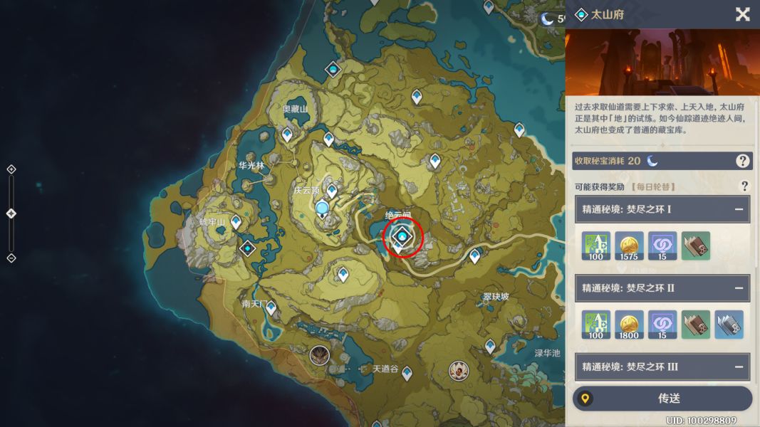 夜兰升级天赋需要「繁荣」系列天赋书,可通过挑战秘境「太山府」获得。下图为「太山府」的具体位置,位于璃月地区。