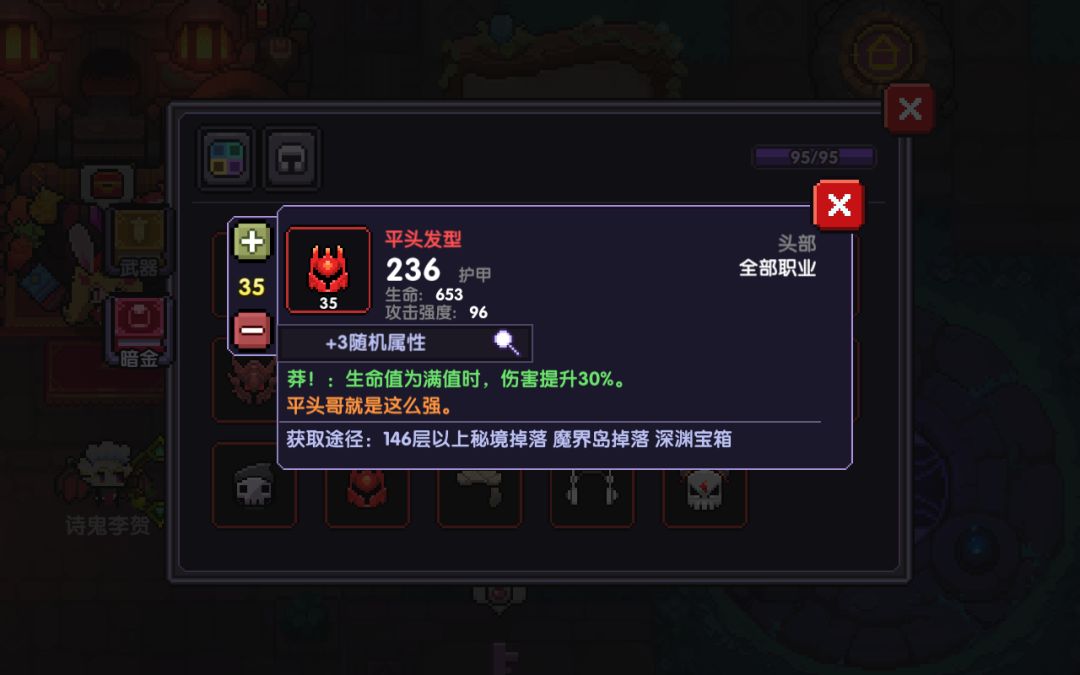 平头是勇者最常用的头部暗金,这个装备可以说是所有人的情怀了,平头的描述是:生命值为满值时,伤害提升30%