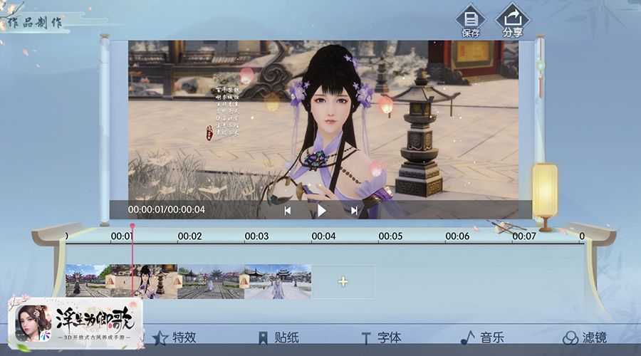 当玩家的影集制作完毕以后,可点击播放按钮进行效果预览,确认无误后即可保存或与自己的好友分享,每位玩家最多可保存5个影集。当然,除了美美的人物,别致的景色也很重要,现在就调整好镜头,上线制作独一无二的动感影集吧!