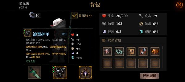 漆黑护甲+充能披风:高护甲值保证挨打不掉血又刷新副武器