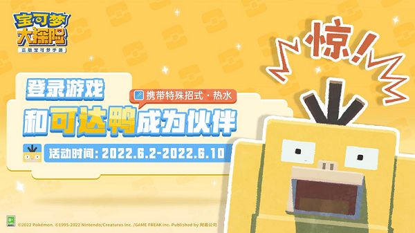 可达鸭这段时间可谓是当之无愧的“顶流”宝可梦,抢不到玩具不要紧,《宝可梦大探险》免费送!6月2日至6月10日活动期间,只需探险家们登录游戏,就能把人气明星可达鸭带回家!值得一提的是,这次的可达鸭自带特殊招式·热水,战力极高,一定能成为探险家队伍里的中流砥柱!