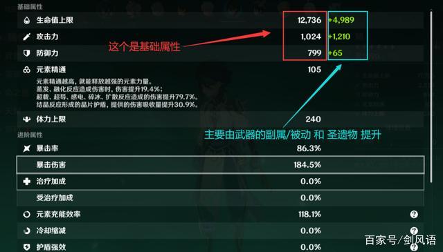 基础属性(生命值、攻击力、防御力)显示白色数字,提升属性则是绿色数字。基础(生命值、防御力)都是来自角色等级提升。基础攻击力来自武器和角色等级提升。角色突破增加(元素伤害,物理伤害、充能、精通、治疗)。