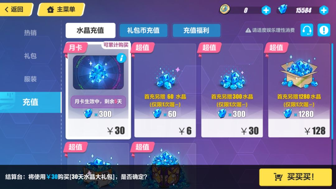 (月卡可直接买。有一点必需记住:月卡买后必须每天登陆领取才能达到以3100水。缺一天不领就会直接划掉当天的水晶奖励,故购买月卡的务必日登一次。)