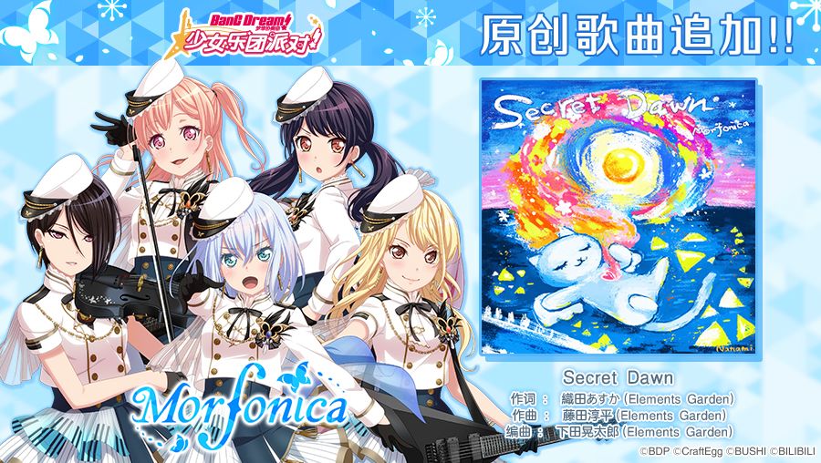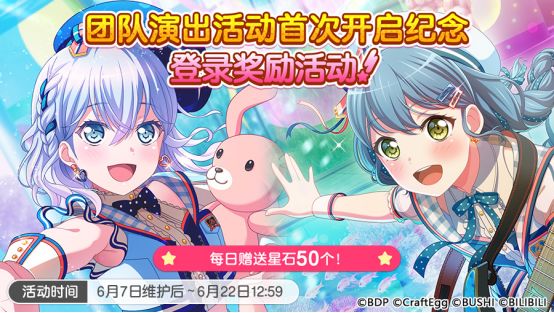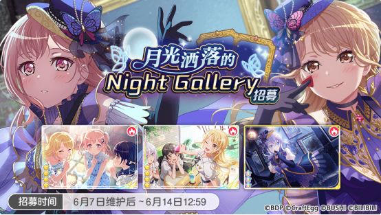 6月7日维护后,游戏内将开启全新活动形式——「秘密与青春的虹彩」团队演出FES活动和「月光洒落的Night Gallery 招募」以及「月光洒落的Night Gallery 限定1次超值招募」;并追加原创歌曲《Secret Dawn》!