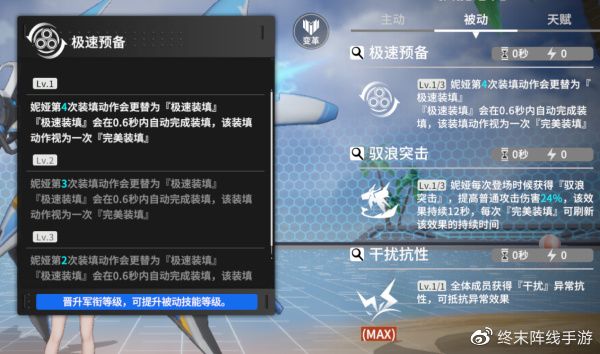 妮娅[S]的核心技能,每4/3/2次装填变成【极速装填】,自动触发完美装填效果,完美装填会给后排骑士提供10%战技充能,所以在升级强化之后,就能够利用完美装填快速换取能量值。