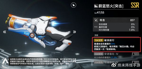 武器选择上自然是有条件的直接上专属武器蔚蓝怒火即可,对队伍的伤害加成能力是最高的,装甲套装则推荐能够提升其技能刷新循环或是增加暴击爆伤的套装,来进一步增加她的输出能力。