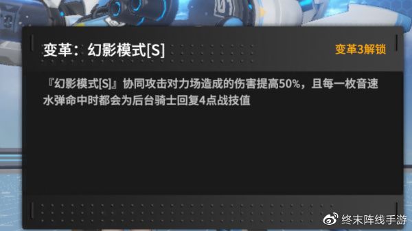 幻影模式期间释放【水花激射】,会触发萨拉天使【S】的协同攻击,每次发射2枚水弹造成7%(满级14%)伤害,对力场造成额外210%伤害,持续10秒。比较常规的伤害BUFF技能,特殊的是连续发射水弹,快速打出伤害同样可以积攒队友战技槽。