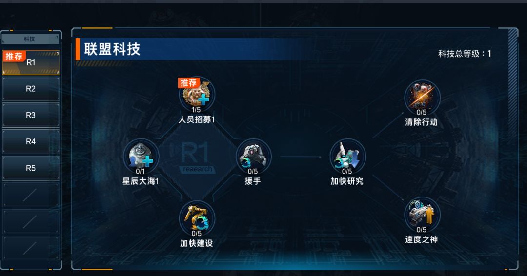 加入联盟的玩家都能够享受联盟科技的加成,联盟技术分为R1-R5五个级别,前置科技研究达到一定等级才可解锁下一级别科技研究。