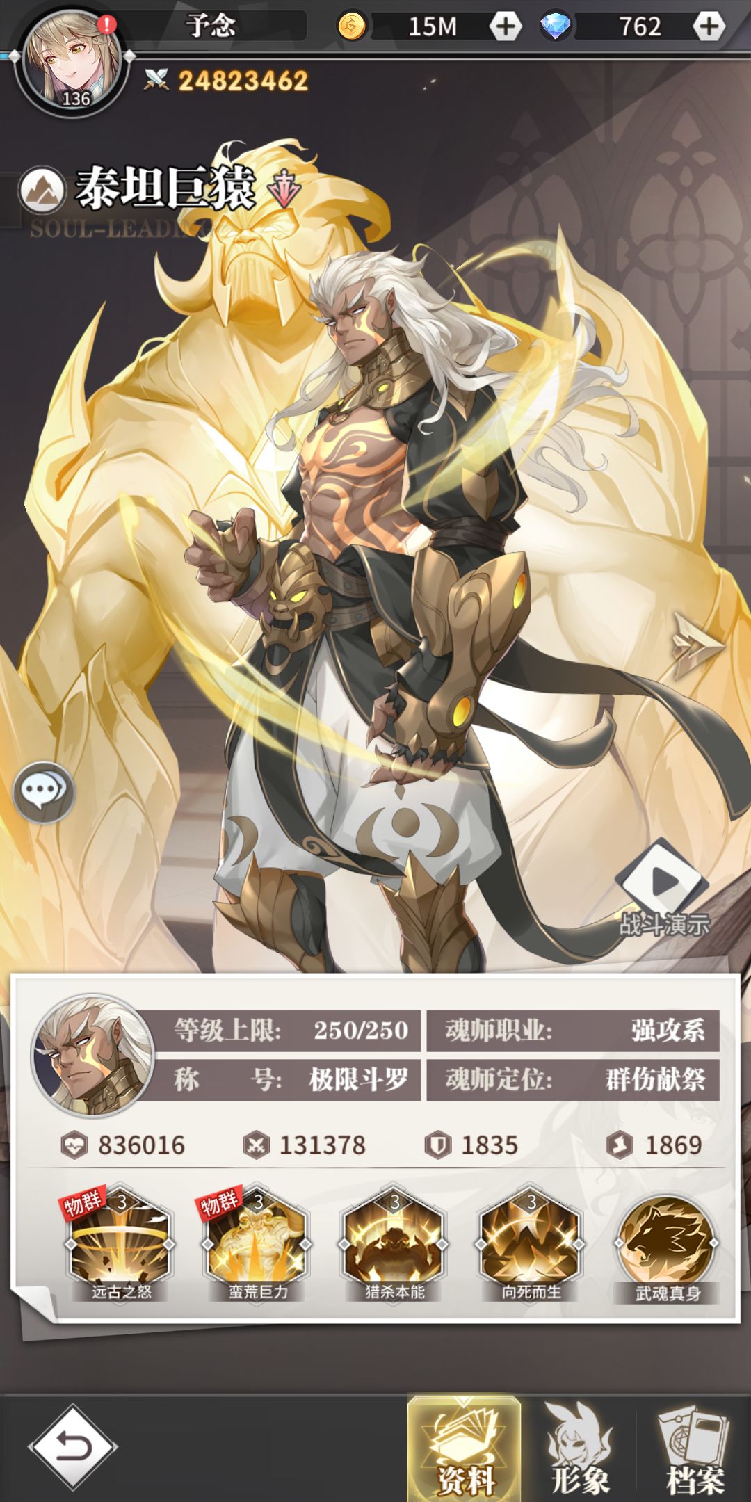 【2技能】泰坦巨猿主要输出手段,这个技能主要依靠百分比跟自身攻击力加成造成巨额伤害,作为可以触发物连的神技,有时候可以一回合放三次二技能。