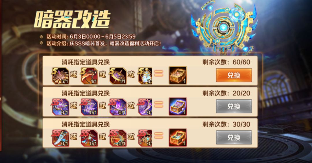 暗器改造活动可以用不需要的暗器碎片兑换SS+暗器碎片6选1、SS暗器以及S暗器碎片,可以各取所需哦!