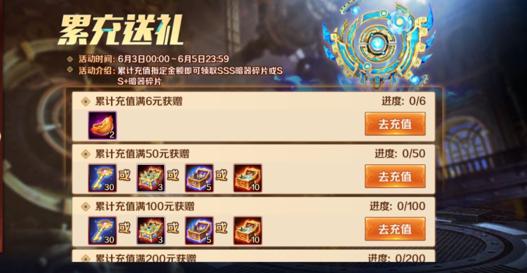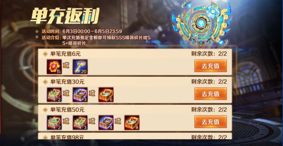 暗器首发期间幸运秘宝同步上线,限时充值活动中累计充值指定金额即可叠加领取转盘币,可用于转盘抽奖!