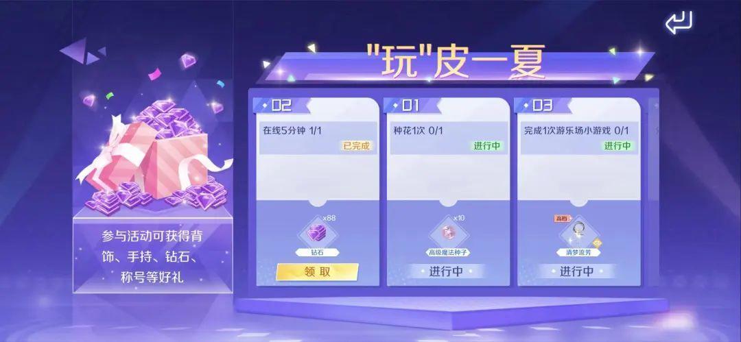 2.【“玩”皮一夏】 送88钻石/背饰/手持/趣味称号/高级魔法种子/点券
