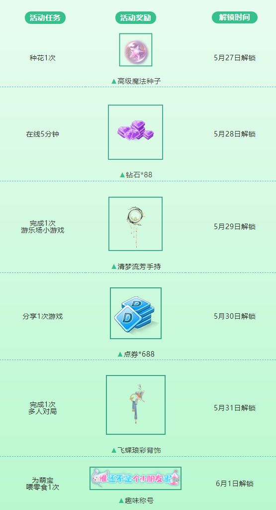截止至6月6日来参与限时活动【“玩”皮一夏】,完成指定任务可获得高级魔法种子&钻石*88&清梦流芳手持&点券*688&飞蝶琅彩背饰&“谁还不是个小朋友呢”六一童趣称号。