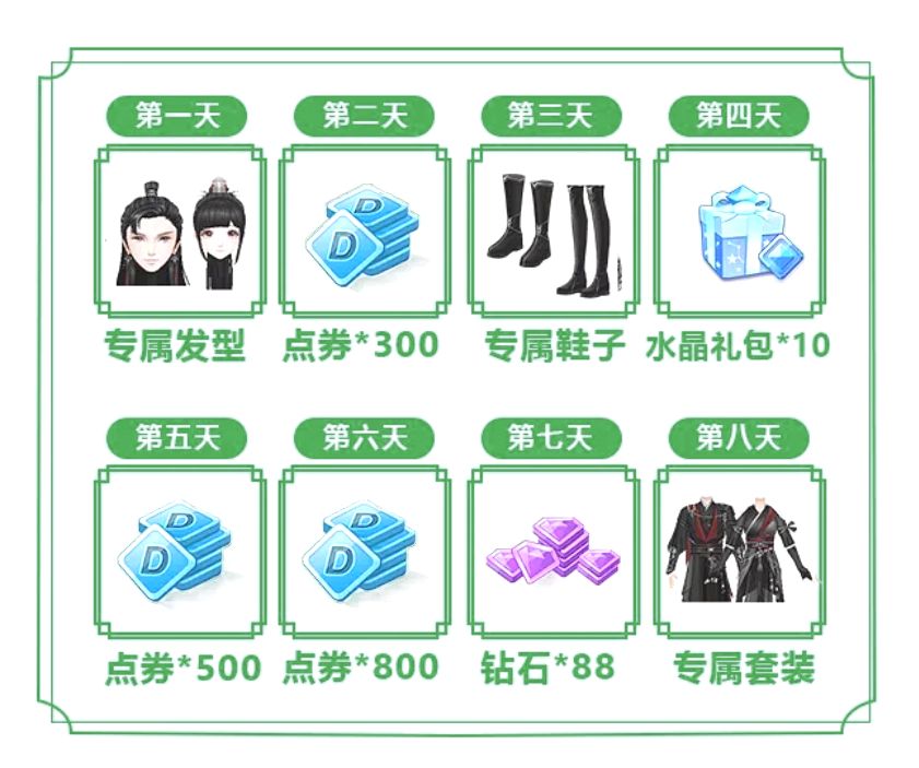 截止至6月4日,连续登录游戏即可带走金吾戍卫高档组合装&88钻石&10水晶礼包&1600点券!动动小手福利全薅~