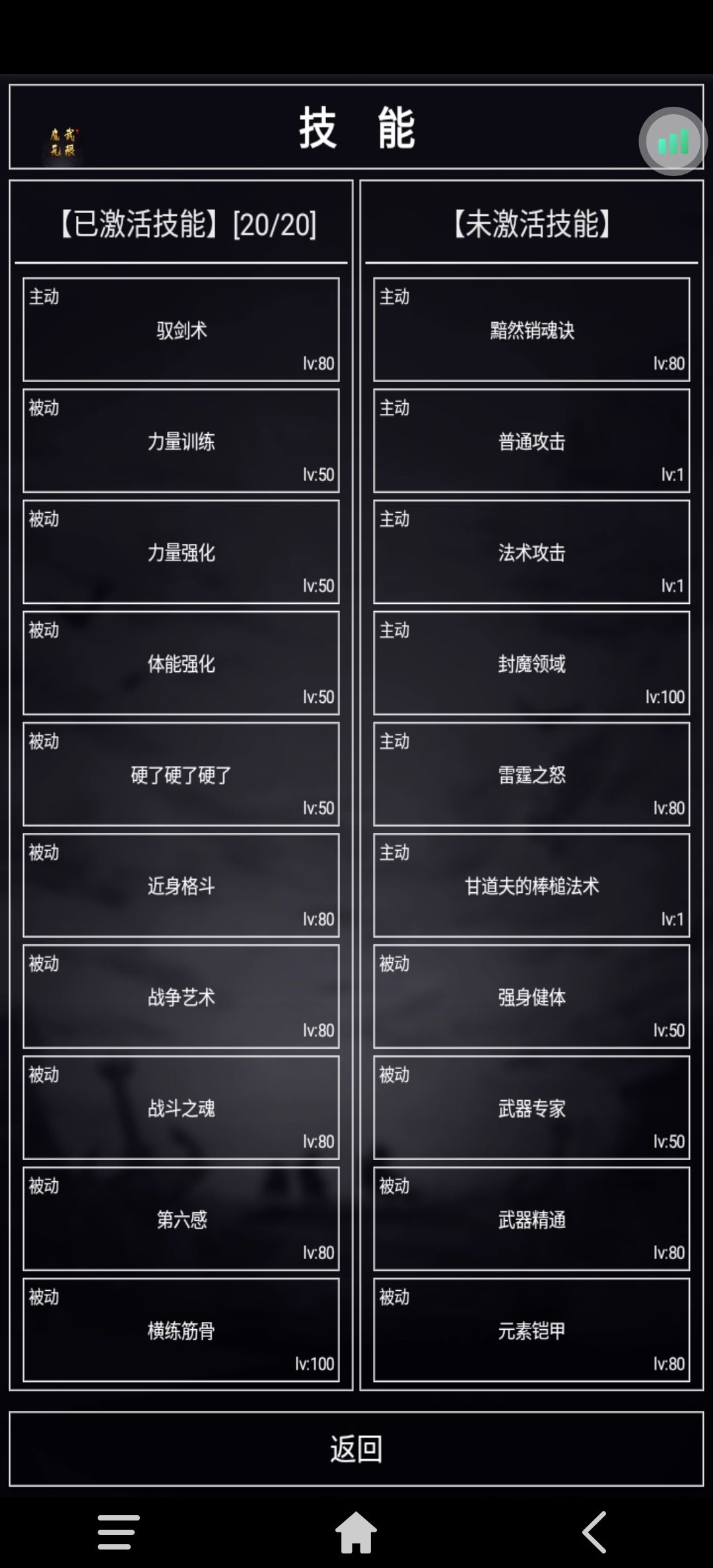 本游戏一共可以选择二十个技能,作为人狼战士,有且只有二十一个选择(限61数据库,以后可能有更强力的技能)!如下图