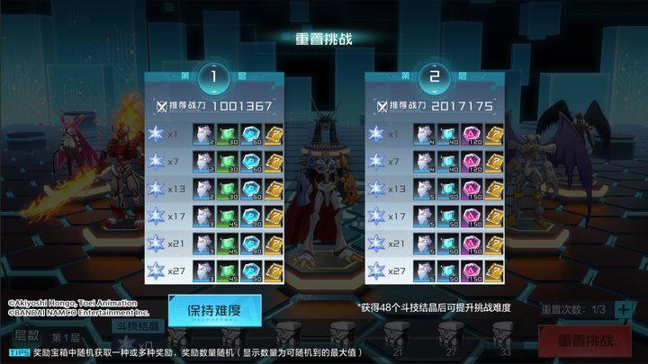 此外,当队长收集到指定数量的斗技结晶,即可领取对应档位的奖励宝箱,开启宝箱后可随机获得强化模块、数码科技、数码宝贝核心代码等丰厚道具奖励。大家可根据编队的战力数值与阵容深度,自行选择保持难度或提升难度哦~