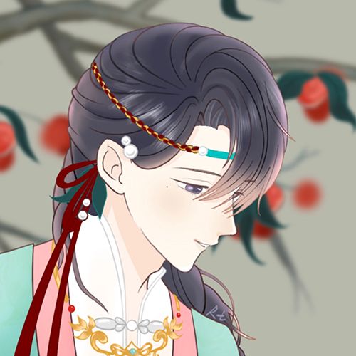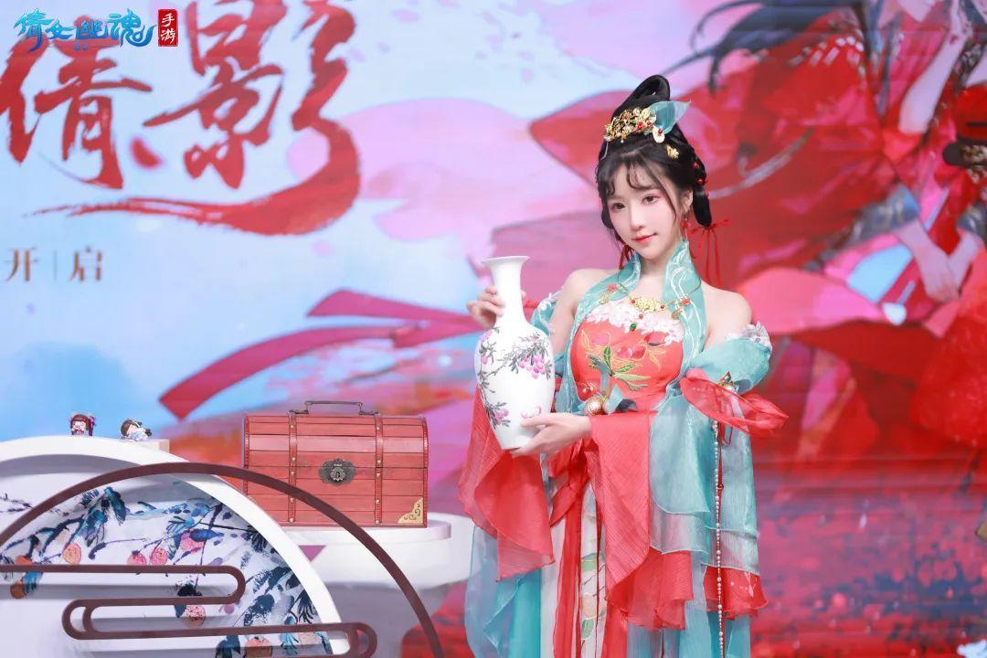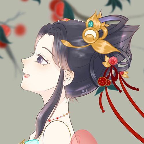 突然一位女子出现在了花瓶前, 她的腰间别着两颗金色荔枝,与衣服的花纹贴合在一起露出晶莹雪白的果肉,好比甘露凝成一颗冰,露浓冰厚更芳馨。
