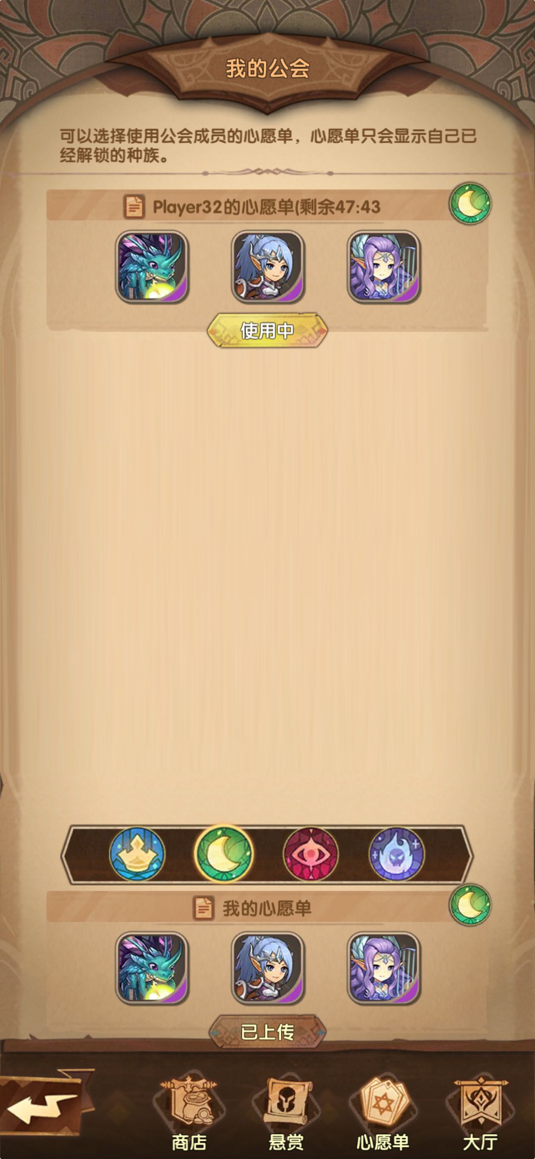 目前玩家疑问最多的功能。每个玩家都可以在公会内共享自己的心愿单,心愿单有刷新时间的倒计时,届时需要玩家在公会内重新选择和上传心愿单,在开启二种族抽卡后有概率抽出选定心愿单里的英雄,加入公会的玩家可以选择公会内成员分享的心愿单,心愿单内同英雄越多,抽到该英雄的概率就越高。