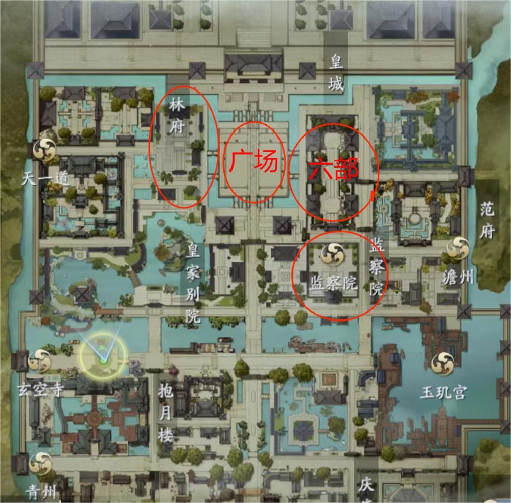 一共四个据点分别为林府、六部、监察院以及广场,其中广场在开始后5分钟才会开放。所以帮派需要将人员先分配到林府、六部、监察院三个点。