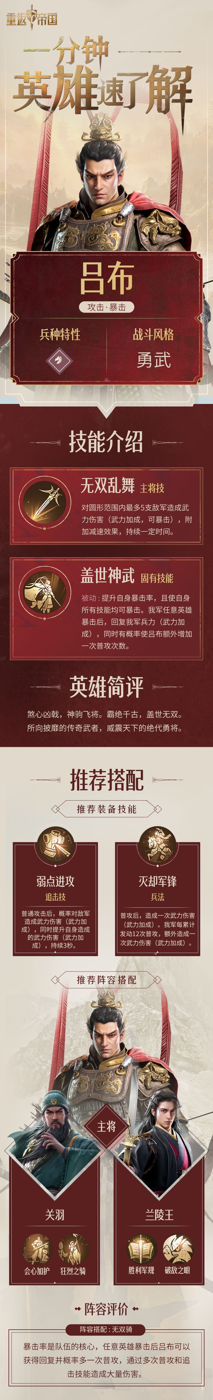 关羽可触发吕布的被动回复,兰陵王则增加了吕布和关羽的出手频率,此阵容勇武追击,盖世无双,帝国人称“
