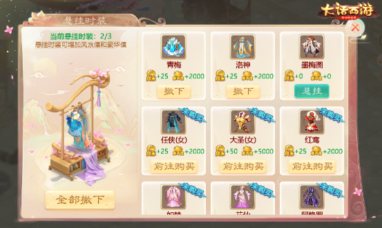 不仅如此,侠士们精心收集的衣饰也能成为房间里最独特的装饰了!购买璎珞垂珠衣架并设置之后,点击家具即可将自己的永久时装悬挂其上,每个衣架最多可悬挂三件时装(墨梅图、越王剑时装暂时未开放悬挂功能,敬请期待),在展示侠士的心爱衣装之余,还可以增加家园风水和豪华度哦!
