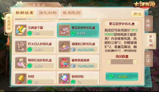 7月2日10点至2020年7月9日5点期间,大话手游多宝阁中将限时上架繁花若梦折扣礼盒(仅在道具服【情系今生】、【相聚长安】、时间服【风生水起】、【鸡年大吉】中开放购买)。家具礼包每人每天限购1个,蜜意家具福袋累计限购10个,侠士们如果想要拥有梦幻桃源仙境般的唯美家园,记得及时前往购买哦!
