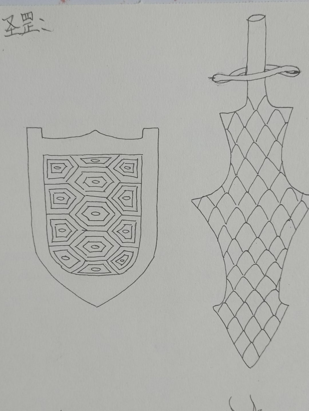 据记载,大多描述都是说玄武是由龟和蛇组成,官方给出圣罡的武器是盾和大剑,我就用龟甲画了盾,蛇鳞画了一把大剑,又在剑柄部分画了一圈小蛇。