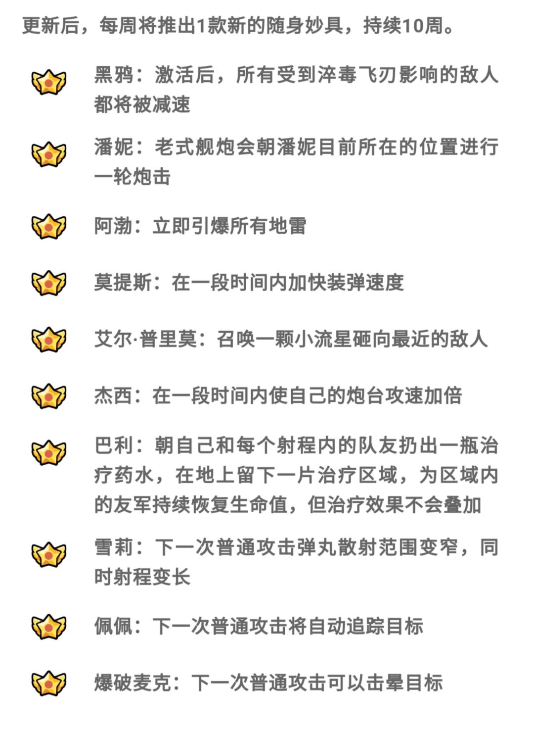 妙具更新的速度有点慢,每周出一个,本次主题季持续时间为十周,也就是会出现十个新妙具。那么目前将近40个英雄也就是需要40周才能全部更完,大半年的时间确实有点慢,后面速度也许会加快。