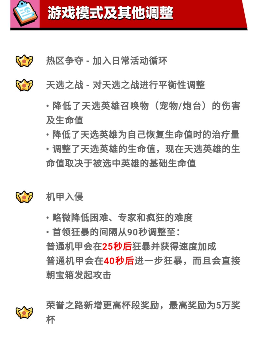 3、天选之战做了一定的平衡性调整,一些热门的天选英雄强度被明显的削弱。因为目前天选之战的环境是杰西活、巴利、妮塔这样的英雄作为天选英雄过于强势。而一些普通的英雄难以对他们造成威胁,赢一局所耗费的精力过大。调整之后游戏体验应该会有很大的改善。