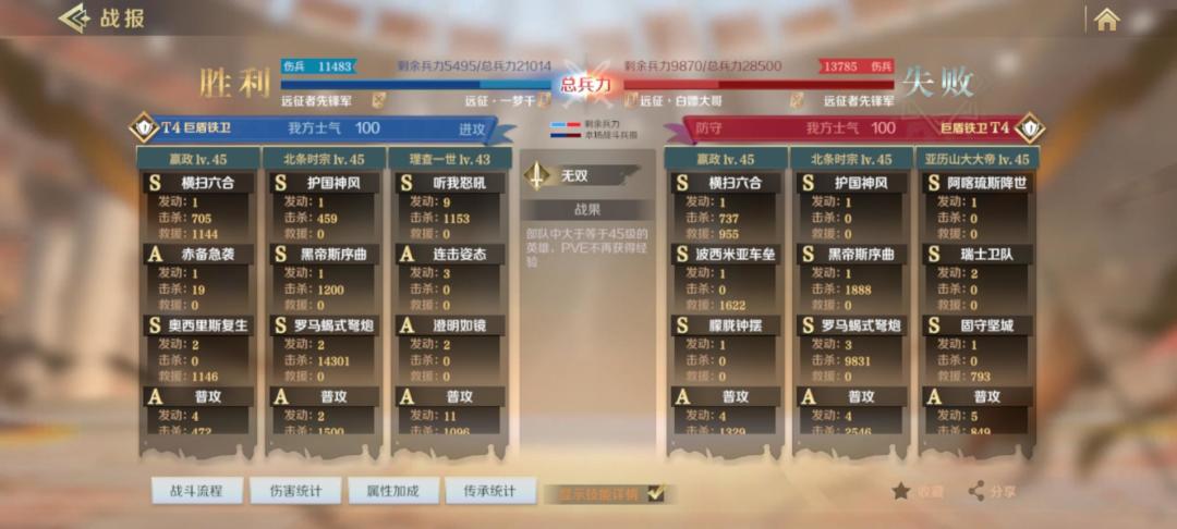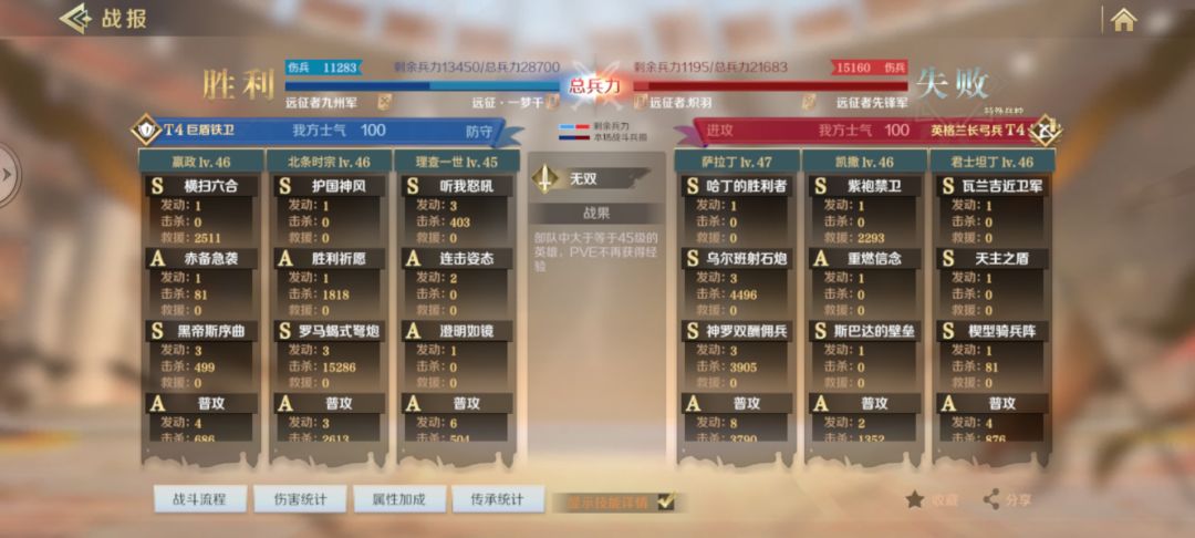 在高额力量下黑帝斯序曲的伤害极为可观,而在罗马蝎式弩炮45%力量的加成下,北条时宗更是达到了恐怖的1092力量,造成48000+的伤害,直接造成对方减员,极快的结束了战斗。