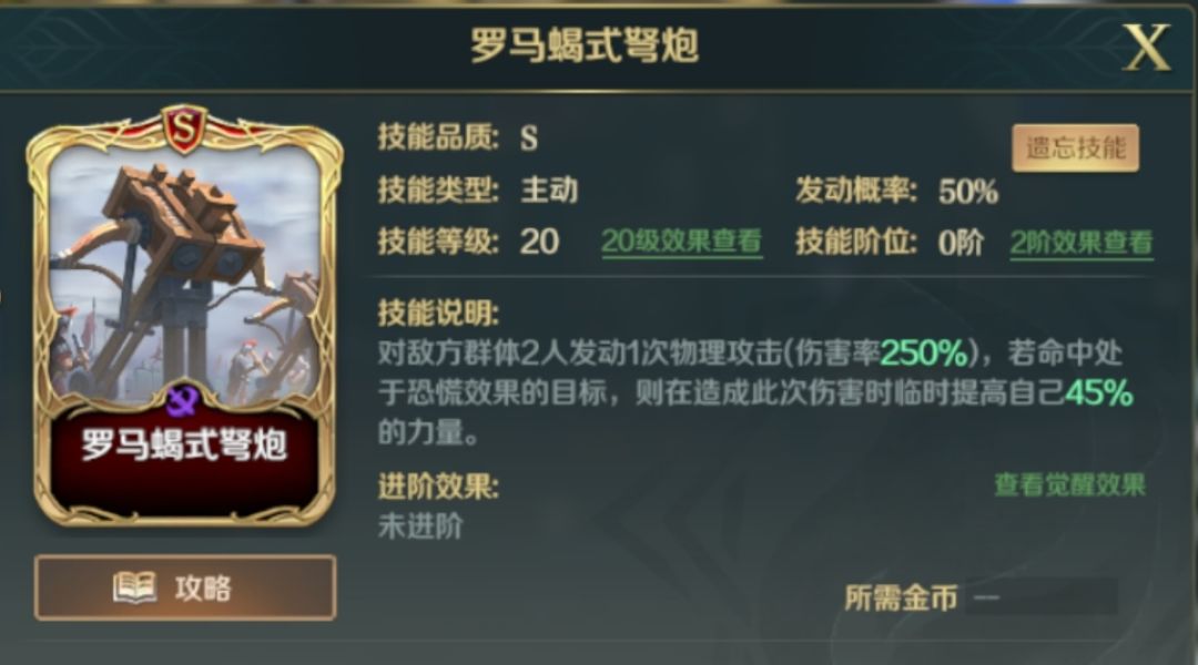 理查一世的专属技能理论上在两回合内给副将叠加力量是无上限的,那么我们可以给理查一世增加连击数和突击发动几率,让理查一世在每回合给副将北条多次叠加力量,可叠加到680-850的力量,在罗马蝎式弩炮45%力量加成下可以增加到上千力量,巅峰可达1200-1400力量,让北条时宗的输出瞬间爆炸。