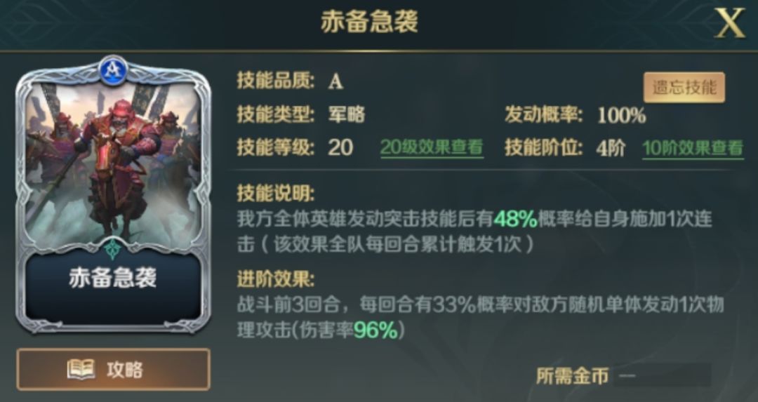 理查一世发动突击技能时,有几率获得一次连击状态,间接提高理查一世专属技能的发动率。