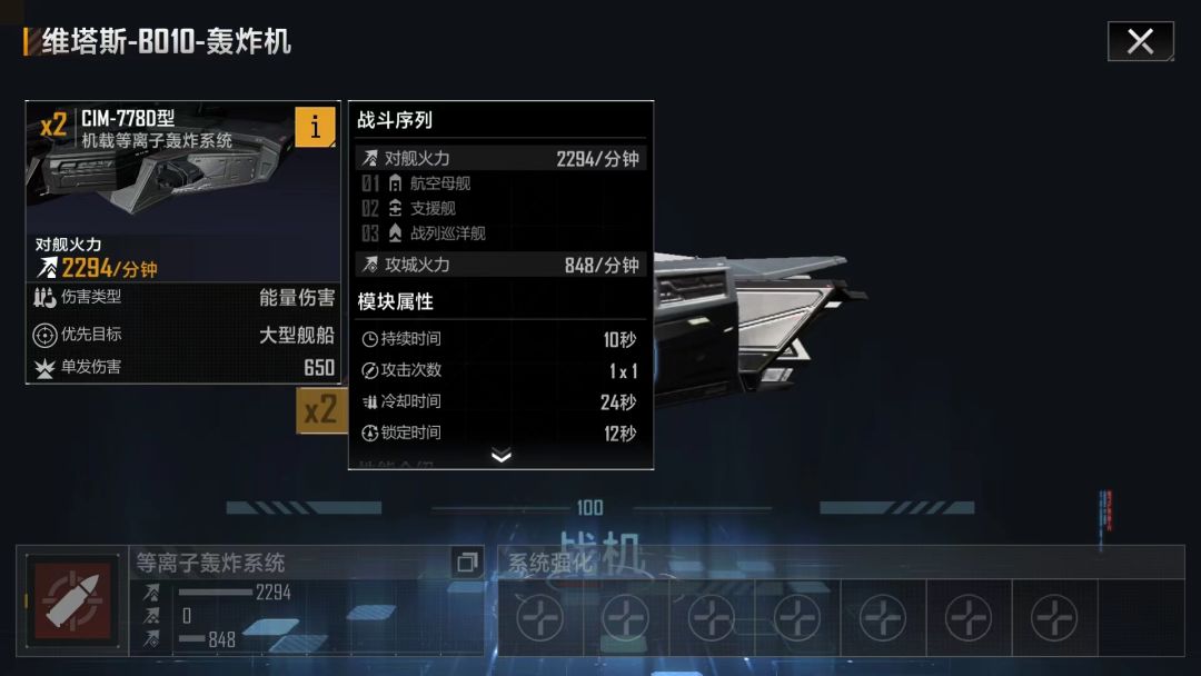 武器介绍:维塔斯-B010搭载两门CIM-7780型机载等离子轰炸系统,强化后每分钟对舰伤害可以达到4540/每分钟,并且伤害类型为能量伤害,强化后的单发伤害为780+234=1014/每分钟,战斗序列为航空母舰>支援舰>战列巡洋舰。强化后的攻城火力为848+444=1292/分钟,攻击持续时间为10秒(每十秒一轮,十秒后冷却,冷却后重新锁敌攻击),冷却时间16.8秒(即攻击后的冷却时间),锁定时间9.84秒(即锁敌时间,锁定之后开始攻击)