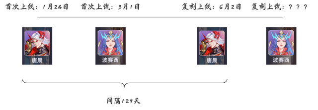 首先我们来看下SP唐晨和SP波赛西的首次上线时间和复刻时间,如上图所示,唐晨的首次上线是在2022年1月24日,而复刻上线则是在2022年6月2日,期间间隔了129天;而如果我们将这个目标转换为SP波赛西,她首次上线的时间是2022年3月1日,如果按照唐晨的间隔129天来推测,则理论上SP波赛西的复刻上线时间应该会在2022年7月8日左右,而这个时间点又到底有多高的可能性呢?我们接着往下看。