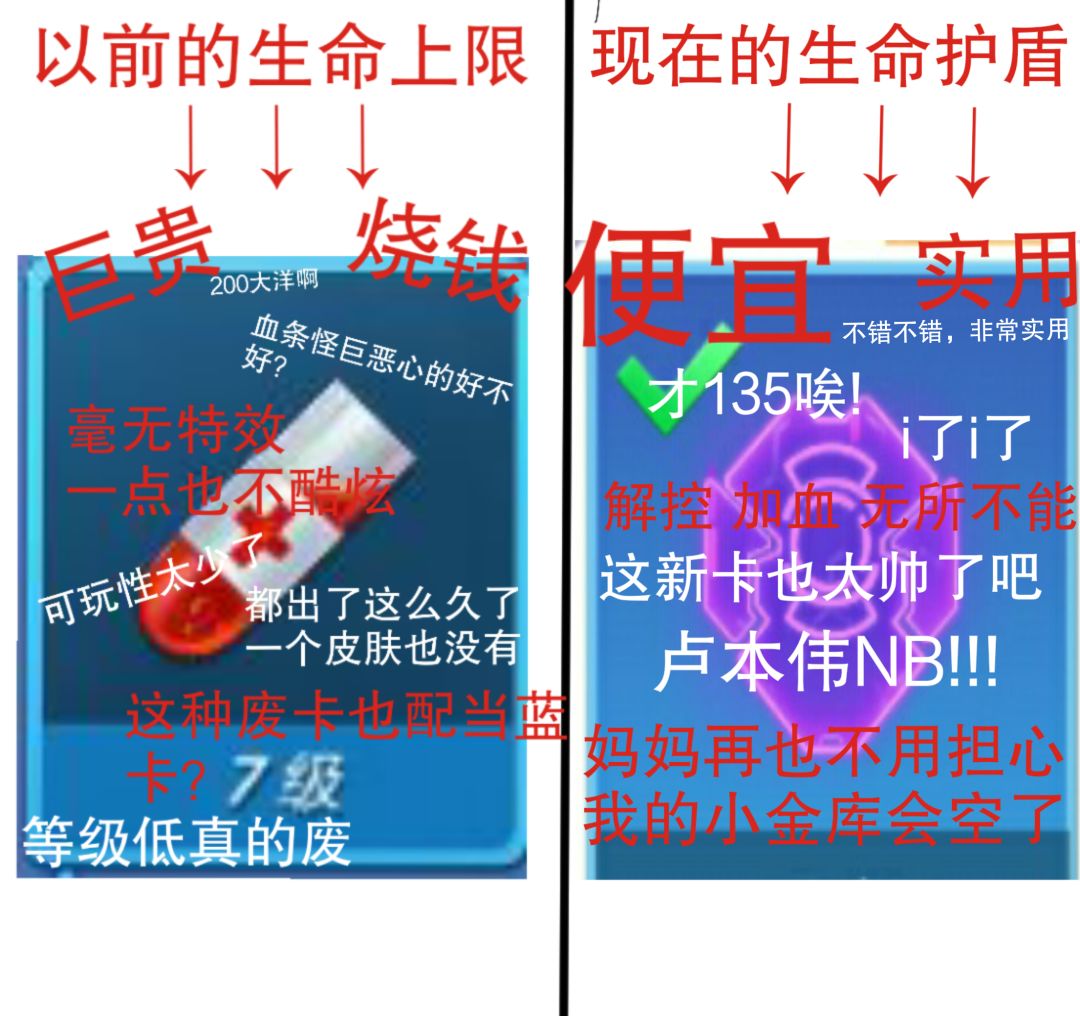 由此可见,新卡完全优化了旧卡的缺点,比如:价格昂贵,玩法性少,没有皮肤不够酷炫等...当然也取消了一些优点,比如:可多次叠血,使用的毫无痕迹但这也丝毫不拉低新卡的强悍,无疑是这次的版本之子。对于新卡,我的评价是(好!)