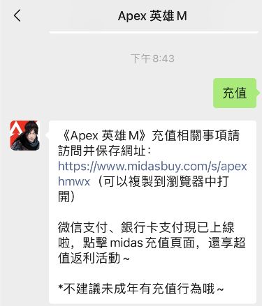 IOS系统由于区服限制,会稍微麻烦一些,需要关注官方公众号“Apex 英雄M”回复:充值,获取充值链接,直接点进去或者复制到浏览器打开;