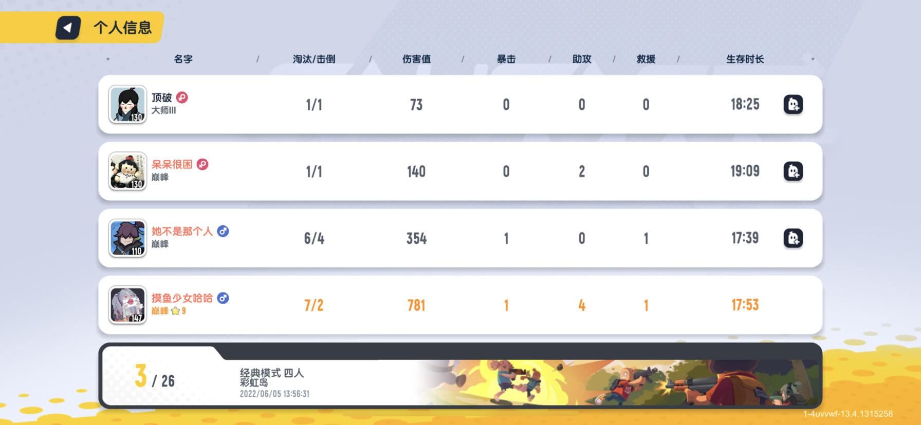 (估计仗着自己杀的多吧,以为自己挺强。结果结束啦我一看,嚯,六个人头三百多伤害😅)
