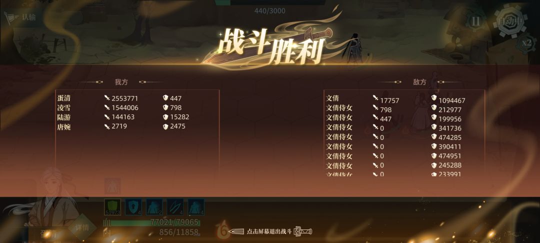 1.打文倩时吃一个出奇制胜,然后上主角凌雪陆游唐婉。对自己伤害有自信的可以自动在控住文倩后不让其回复直接秒杀,不然就要手动绕到后面清小怪。