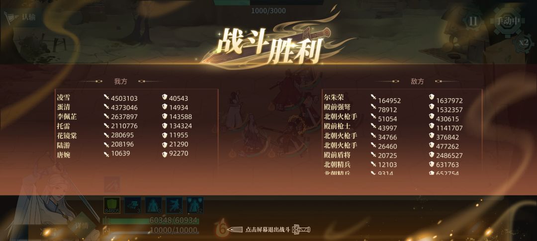 4.尔朱荣 把最后一个出奇制胜吃掉,主角、凌雪、陆游、唐婉、拖雷、李佩芷、和尚全上。前两波可开自动,第三波尔朱荣出现后陆游先优先敲盾兵的挡刀使其无法挡刀后清枪兵和弓兵。晕住后转身敲尔朱荣使其击杀。