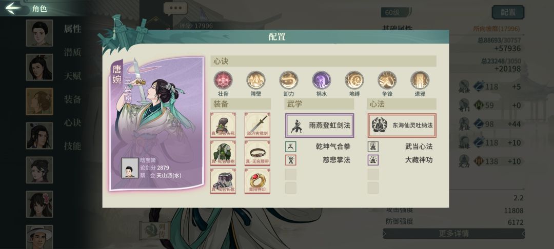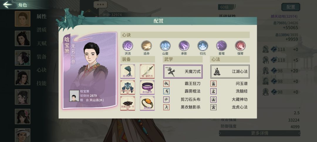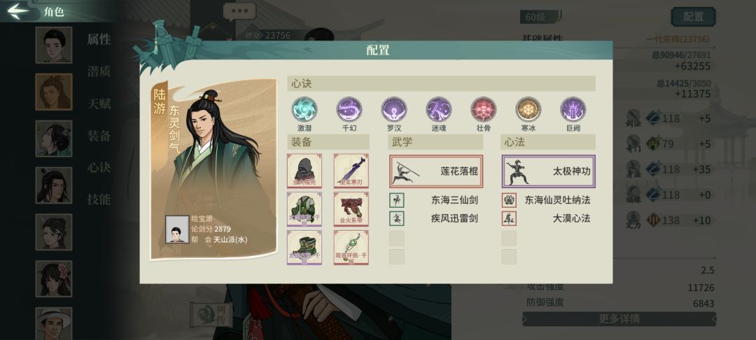 武学:主武学可以换太极拳,记得换武器天机掌。墨子悲丝和其他门派武学没试