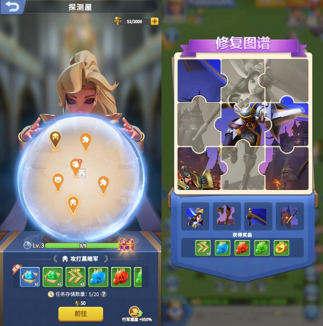 探测分消除魔物、修复图谱、救援士兵、攻打黑暗军、黑暗军首领5种玩法,可从中获取大量资源、魔法精粹、加速道具等任务奖励。