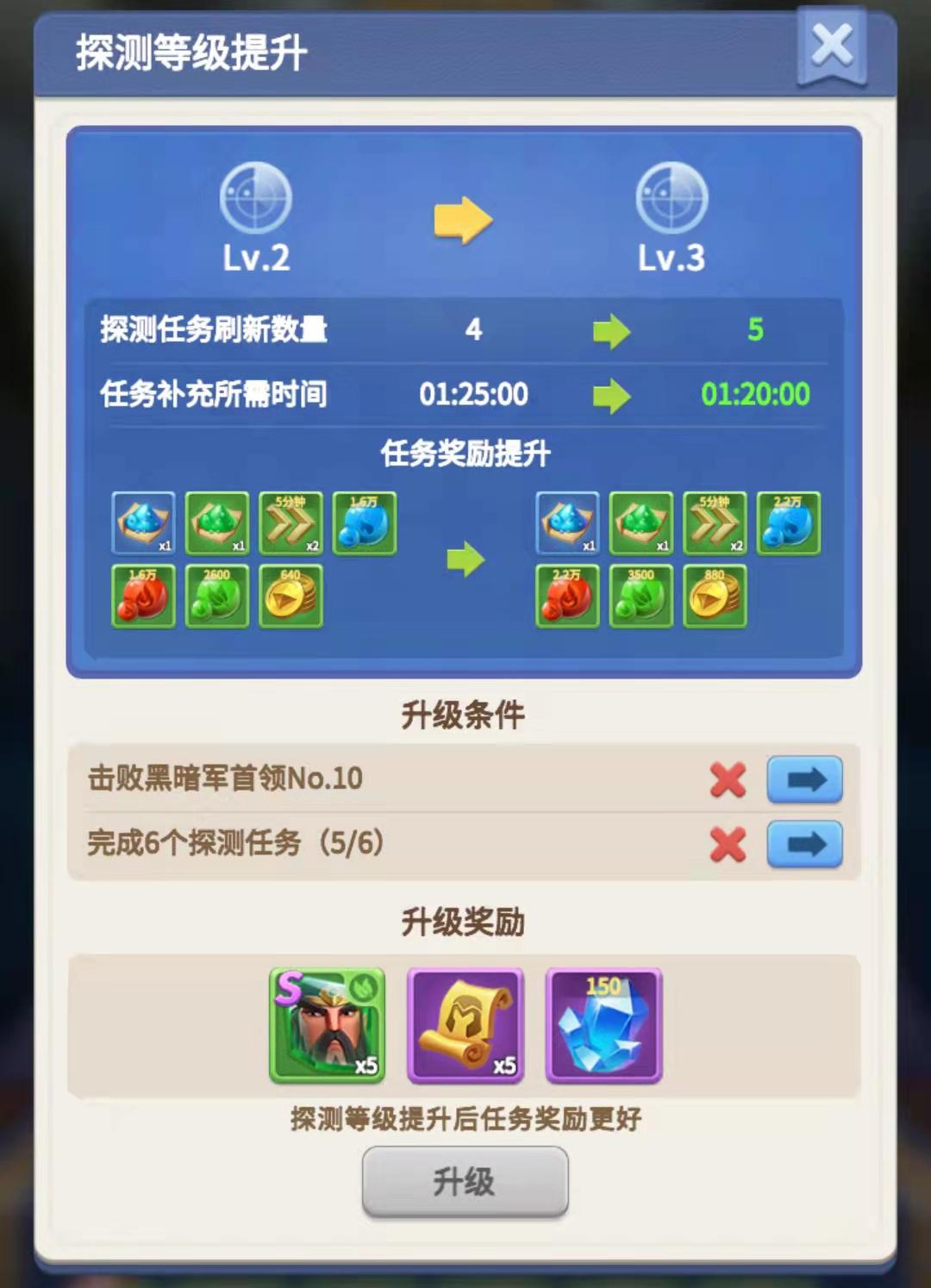 探测任务可升级,需达到一定任务数量和黑暗军首领挑战进度的前置条件,升级后探测任务奖励随之提升,并且获得青龙武圣碎片、钻石和高级英雄招募券的升级奖励。