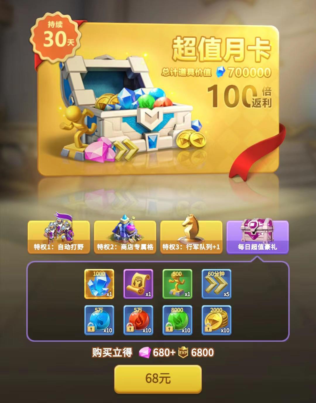 领主们还可购买四合一月卡,里面包含自动打野功能,不但可以解放自我日常更轻松,还能获取额外的行动力。