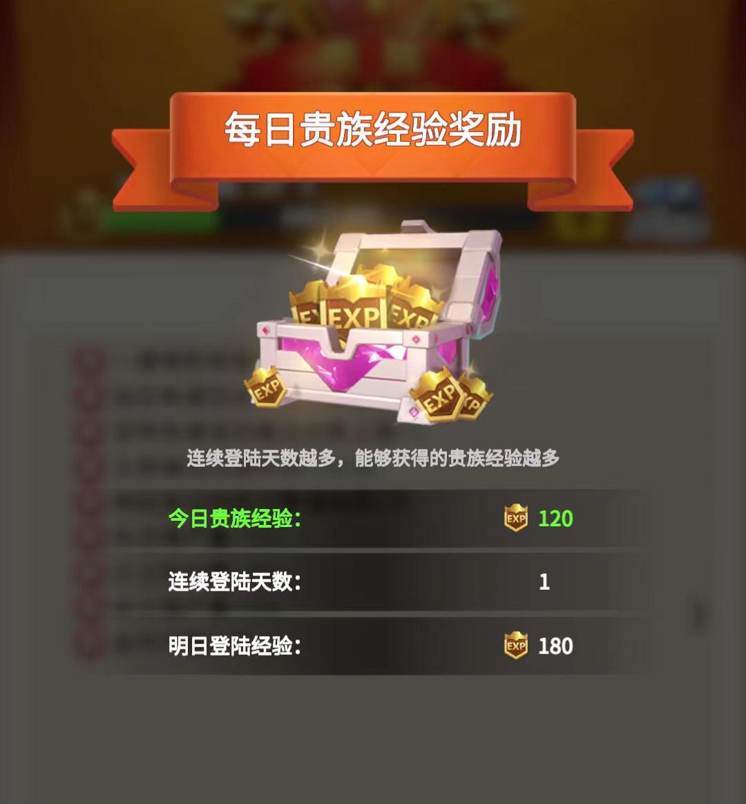 每天打开贵族界面都可获得一个贵族经验宝箱,连续登陆天数越多,获得的贵族经验也就越多,同时还有包含多种资源的每日礼包领取哦!