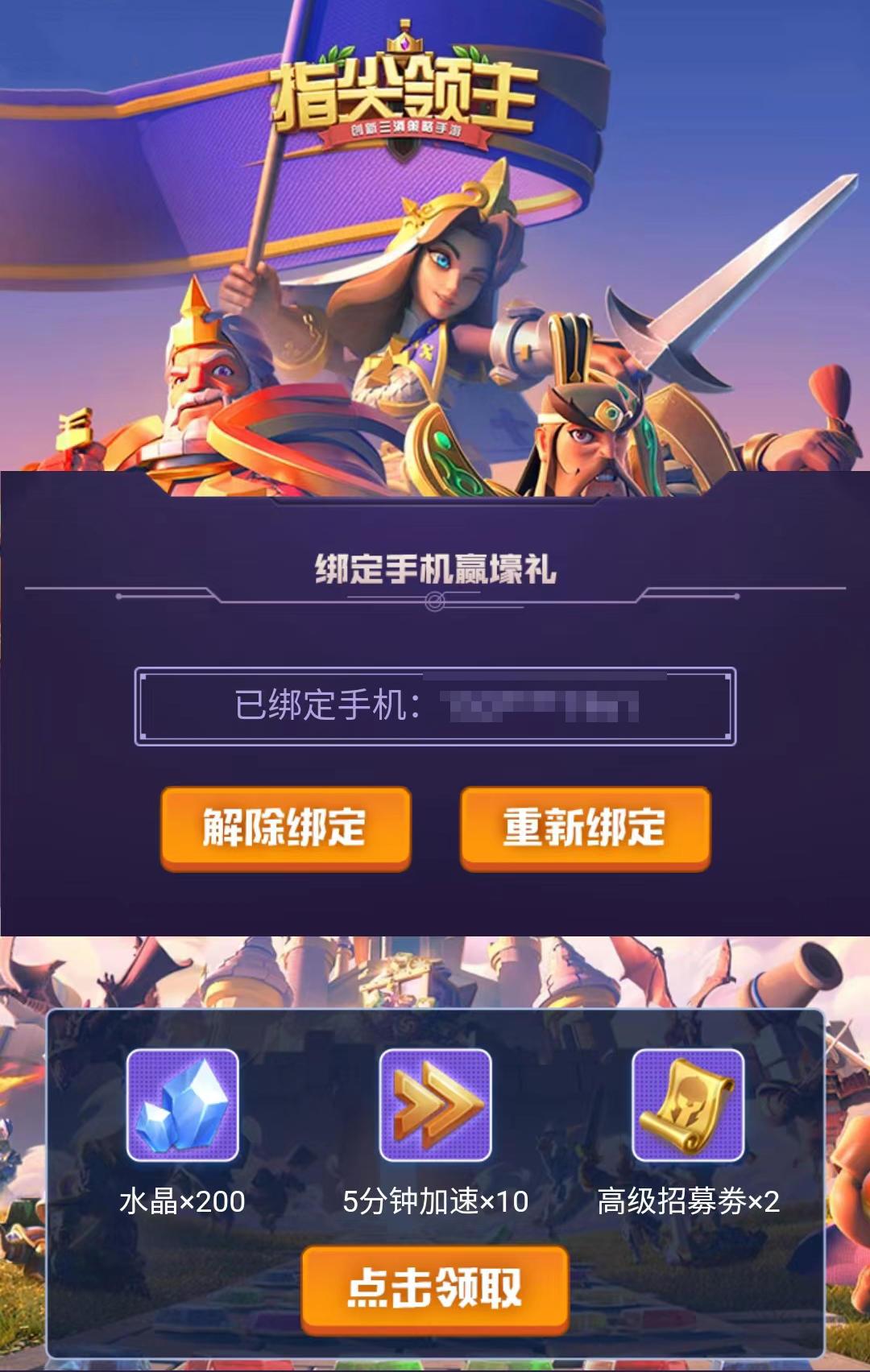 在活动界面绑定手机即可领取水晶、高级招募券、加速道具奖励哦!