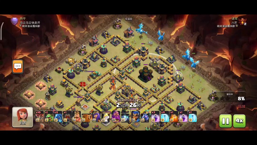 打法:雷龙加少量法术爆本加清边,然后四王加攻城(看情况选)进阵配合剩余的大量法术推平。