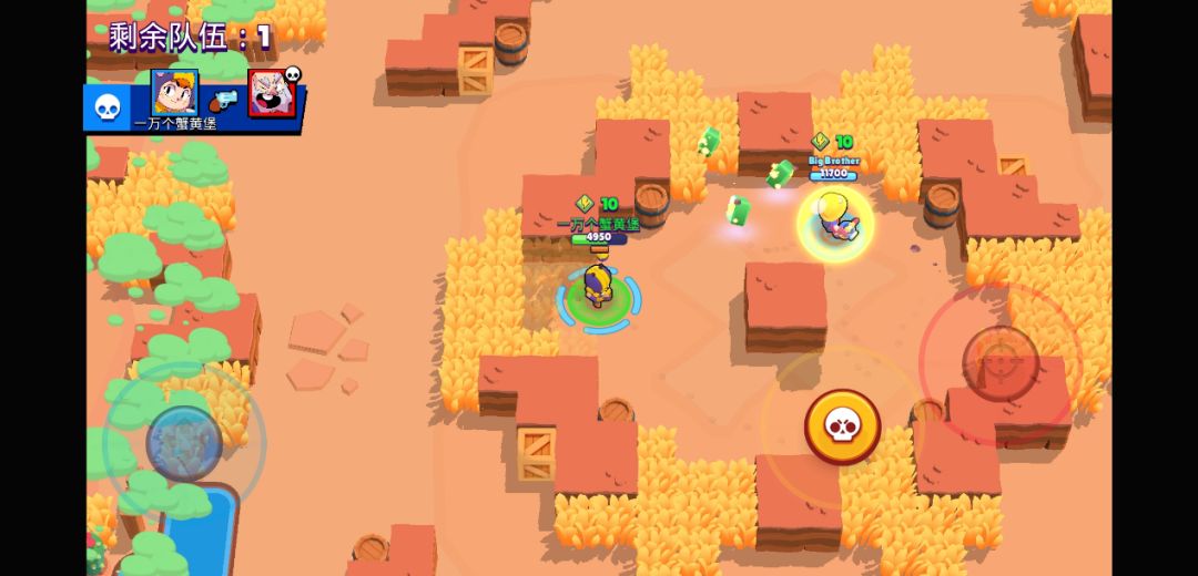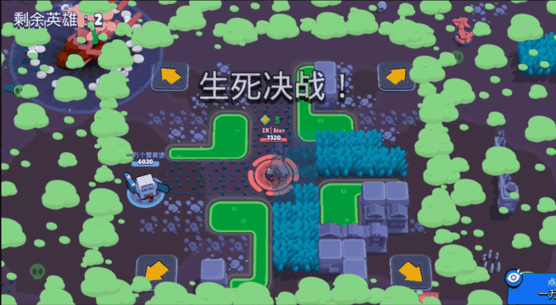 这张地图有随机饮料道具,并且中心位置常聚集许多能量箱,属于耗时比较短的快节奏地图。艺高人胆大的同学可以选择潘妮、比比这类快速清箱的英雄,机动性强的达里尔比较适合抢饮料,也利于逃脱追击;超长射程的布洛克和佩佩抢夺饮料后一枪一个小朋友,也很激爽。