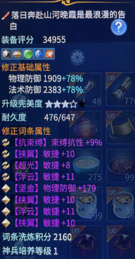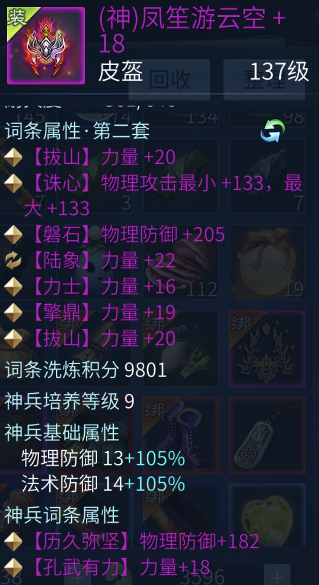 然后还不能忽略的是:神兵词条位置还有一个力量+18,整个头盔力量加成115,还能提升物理防御517点。大赞!!!