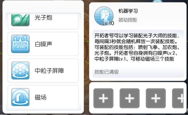 (1)在神域精英难度副本当中,机器人伤害不足以击杀小怪时,开拓者号技能带白噪声、中粒子屏障和磁场就行了。人工智能状态下,机器人负责沉默小怪和控制。机器人的技能随缘释放的,大概3s左右放一次,所以你配备的技能越少,机器人越能精准的放你所需要的技能。磁场这样的控场技能,铁匠本体的磁场技能冷却较高,不能长时释放,而且需要材料,机器人释放全看心情。(中粒子可以不用配备,大多小怪都是近战,中粒子屏蔽远程的)